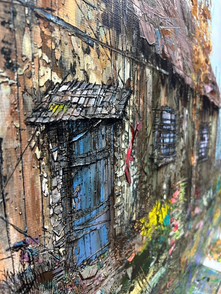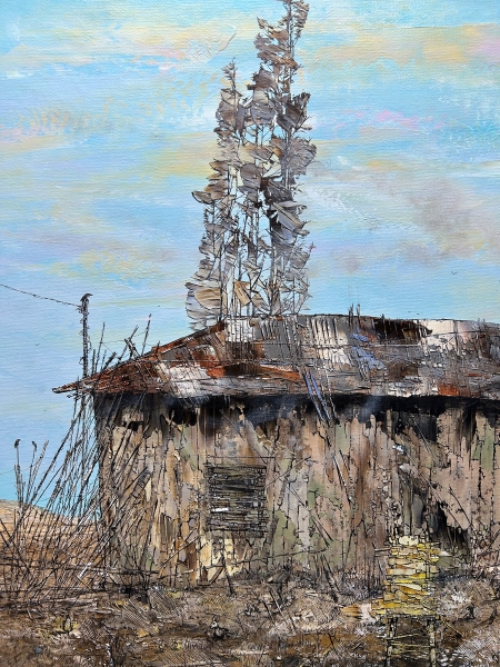 Candaş’ın resimlerindeki yapılar, tamamlanmış “ev”ler olmaktan çok, korunma ihtiyacının izlerini taşıyan yapılardır. Duvarlar, çatılar ve üst üste binen katmanlar; planlı bir mimarinin değil, zamana yayılan deneyimlerin oluşturduğu birikimi yansıtır. Bu yapılar çoğul bir düzen içinde yer alsa dahi, her biri kendi içine kapalı, tekil bir varoluşu temsil eder.
